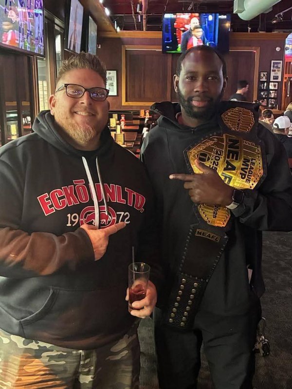 CONGRATULATIONS TO THE NEAFL 2025 LEAGUE MVP QB TYRIQ SMITH . SMITH PICTURED HERE WITH LEAGUE COMMISSIONER