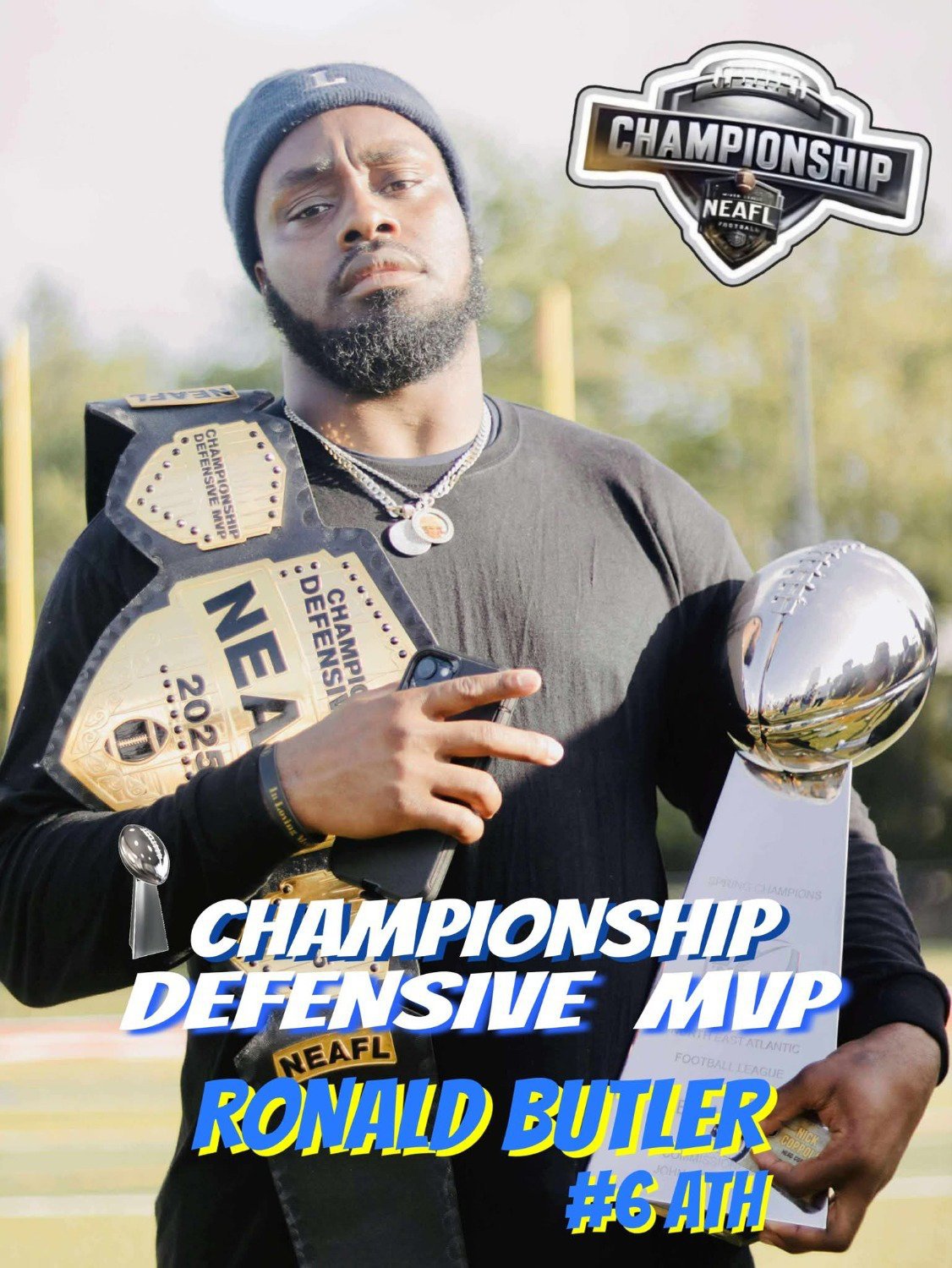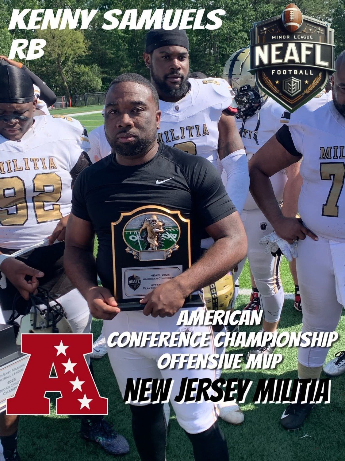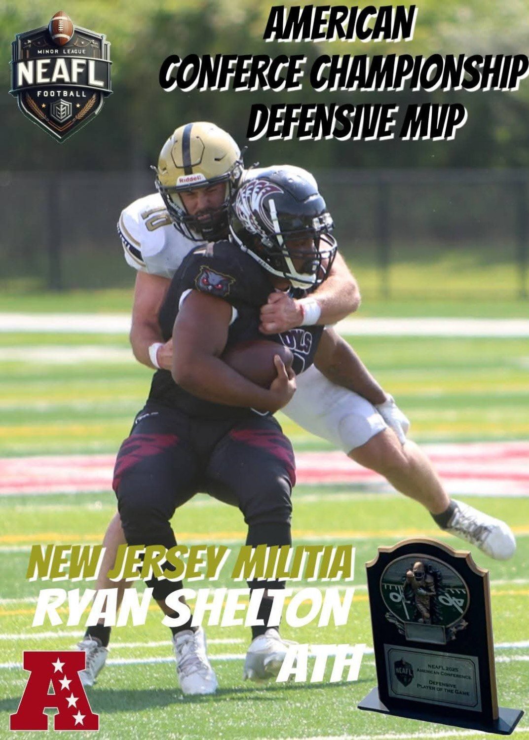 NEAFL 2023 LEAGUE MVP CAM BELL OF THE CUMBERLAND COUNRY AND COMMISSIONER JOHN CIEPLENSKI.